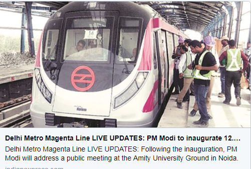 नोएडा, 25 दिसंबर (भाषा) प्रधानमंत्री नरेंद्र मोदी ने आज दिल्ली मेट्रो की 12 किमी लंबी मेजेंटा लाइन का आज उद्घाटन किया। उन्होंने बॉटेनिकल गार्डन से ओखला बर्ड सेंचुरी स्टेशनों के बीच मेट्रो की सवारी भी की ।