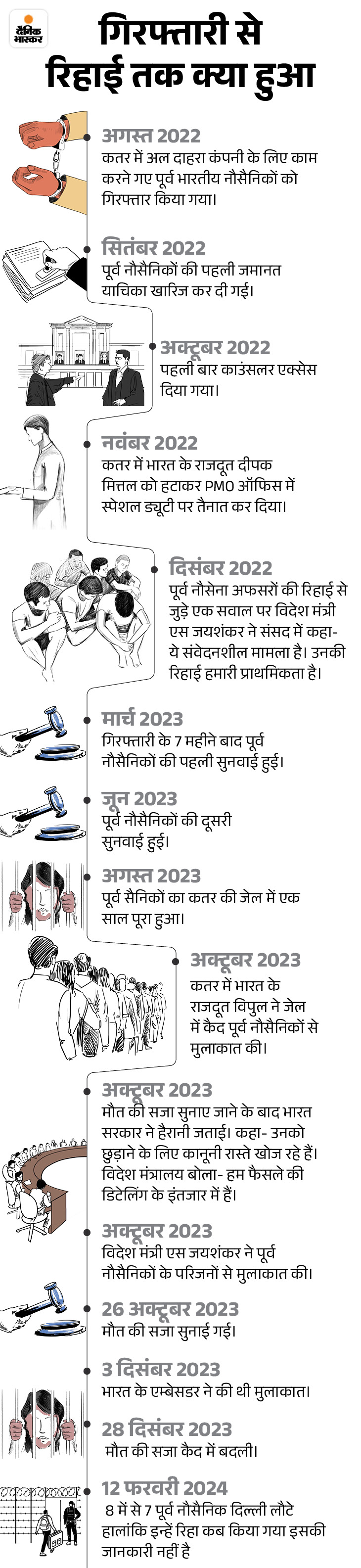 कतर ने 8 पूर्व भारतीय नौसैनिकों को रिहा कर दिया था। इनमें से 7 पूर्व नौसैनिक 12 फरवरी को सुबह भारत लौट आए। कतर की इंटेलिजेंस एजेंसी के स्टेट सिक्योरिटी ब्यूरो ने 30 अगस्त 2022 को इन 8 पूर्व नौसैनिकों को गिरफ्तार किया था।