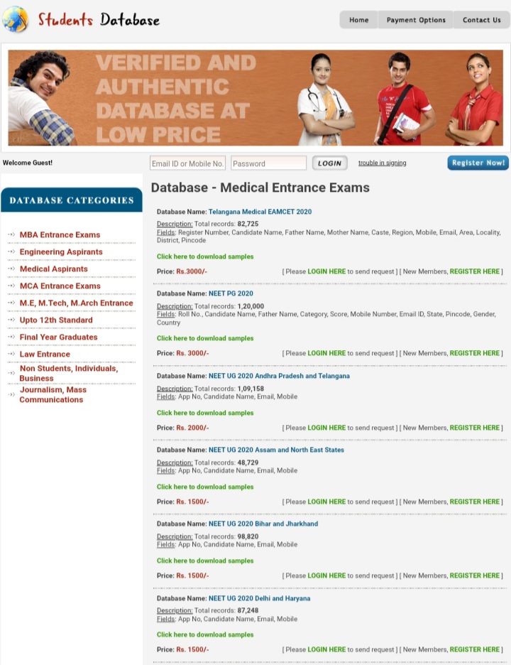 परीक्षाओं की तिथि नज़दीक आते ही एमबीबीएस की सीटों पर दाखले के लिए खेल शुरू हो जाता है। दलाल विभिन्न वेबसाइट्स के माध्यम से स्टूडेंट्स के डेटा को खरीदते हैं। मेरे द्वारा पहले ही करीब 15 से ज़्यादा ऐसी वेबसाइट्स की जानकारी दी गई है, जो आज भी नीट-जेईई के स्टूडेंट्स की निजी जानकारी खुलेआम बेच रहे हैं। आपको इन वेबसाइट्स पर वर्ष 2016-17 से लेकर 2020 तक के तमाम डेटा मिल जाएंगे, जिसकी कीमत करीब 3 हज़ार से 10 हज़ार रुपये होती है।