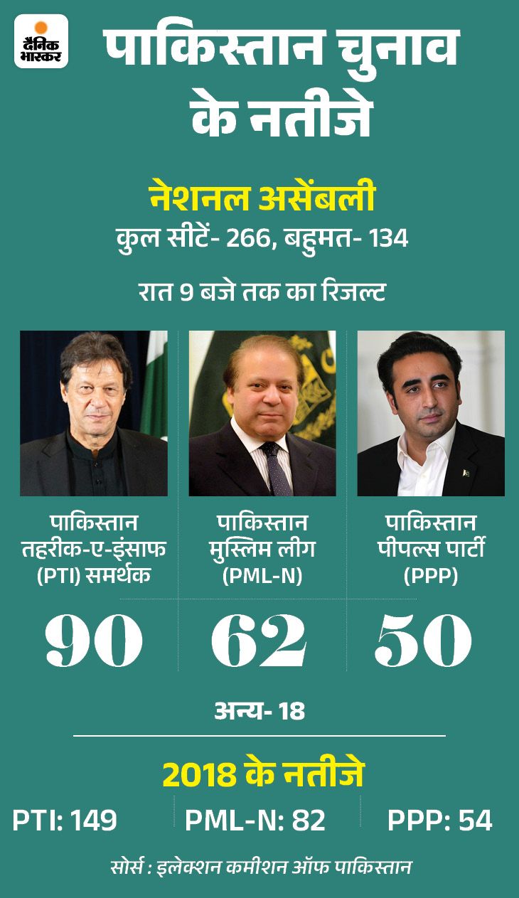 अब तक 265 में से 138 सीट के रुझान सामने आए हैं। इमरान की पार्टी के समर्थन वाले निर्दलीय 82 सीटों पर आगे हैं। 35 पर नवाज शरीफ की पार्टी पीएमएल-एन और 17 पर पाकिस्तान पीपुल्स पार्टी के कैंडिडेट्स आगे है।