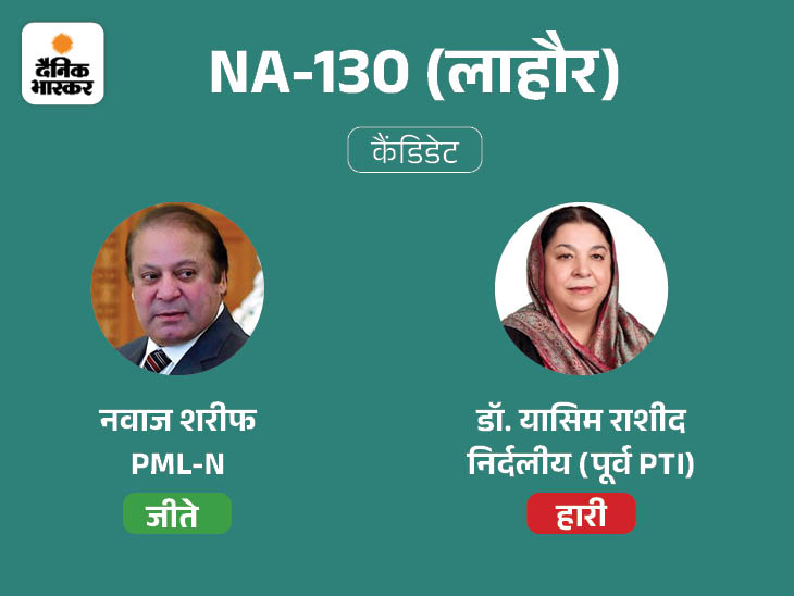 PMLN लाहौर की NA 130 सीट पर नवाज शरीफ की जीत का दावा कर रही है। हालांकि, चुनाव आयोग ने अब तक यहां से आधिकारिक नतीजा घोषित नहीं किया है। PMLN ने इससे पहले मनसेहर सीट NA-15 से भी जीत का दावा किया था। लेकिन जब चुनाव आयोग ने नतीजे घोषित किए, तो नवाज यहां से हार गए।