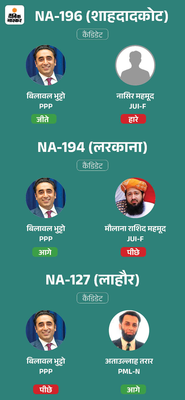 लाहौर से नेशनल असेंबली की सीट 127 पर बिलावल भुट्टो जरदारी नवाज की पार्टी पीएमएल-एन के कैंडिडेंट और पूर्व कानून मंत्री अता तरार के मुकाबले पिछड़ गए हैं। बिलावल को 7823 और तरार को 8632 वोट मिले हैं। वो पहले तरार से आगे चल रहे थे।