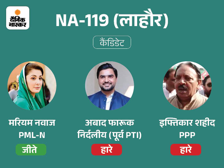 नवाज शरीफ की बेटी मरियम नवाज लाहौर NA-119 सीट से जीत गई हैं। यहां से PTI समर्थक उम्मीदवार शहजाद फारूग हार गए।
