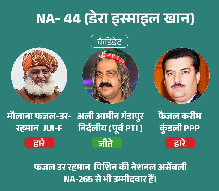 JUI-F चीफ मौलाना फजल-उर-रहमान खैबर पख्तूनख्वा की डेरा इस्माइल खान (NA-44) सीट से हार गए हैं। इस सीट से PTI समर्थक अली अमीन गंडापुर ने जीत दर्ज की। दोनों के बीच 33,109 वोटों का अंतर रहा।
