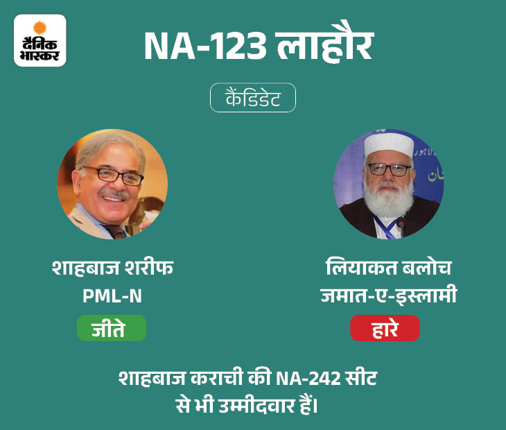 पाकिस्तान चुनाव आयोग के अनुसार, पूर्व प्रधानमंत्री और PML-N चीफ शाहबाज शरीफ लाहौर से NA 123 सीट से जीत गए हैं।