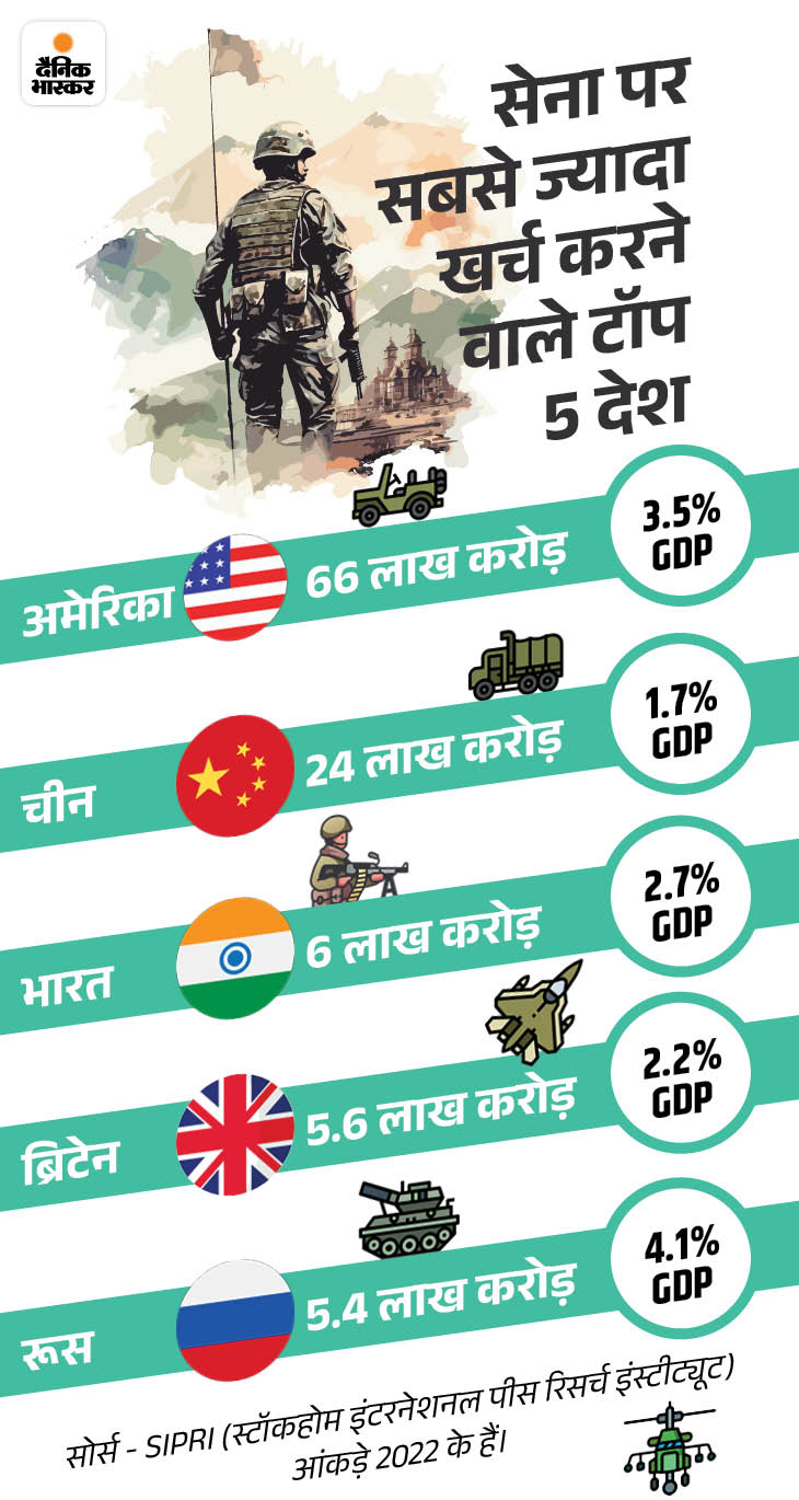 अमेरिका और चीन के बाद भारत मिलिट्री पर खर्च करने वाला दुनिया का तीसरा सबसे बड़ा देश है। स्टॉकहोम इंटरनेशनल पीस रिसर्च ऑर्गनाइजेशन की रिपोर्ट के मुताबिक (SIPRI) भारत ने 2022 में अपनी सेना पर 76.6 बिलियन डॉलर यानी 6 लाख करोड़ रुपए खर्च किए हैं। जो 2020 के मुकाबले 0.9% और 2012 के मुकाबले 33% ज्यादा है। 2023 में भारत के रक्षा बजट में 69 करोड़ रुपए का इजाफा किया गया था।
