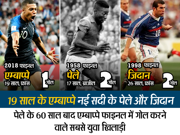 पेले ने एम्बाप्पे के लिए ट्वीट किया : एम्बाप्पे ने फ्रांस को 65वें मिनट में गोल कर 4-1 की बढ़त दिलाई थी। इसी के साथ वे पेले के 60 साल बाद फाइनल में गोल करने वाले दूसरे सबसे युवा खिलाड़ी बन गए। पेले ने 1958 में स्वीडन के खिलाफ गोल कर टीम को जीत दिलाई थी। तब उनकी उम्र महज 17 साल थी। एम्बाप्पे की उम्र 19 साल है। इस मौके पर पेले ने ट्वीट भी किया। उन्होंने लिखा, “दूसरा किशोर जिसने विश्व कप फाइनल में गोल किया। क्लब में स्वागत है एम्बाप्पे । थोड़ा साथ मिलना बेहतरीन है।”