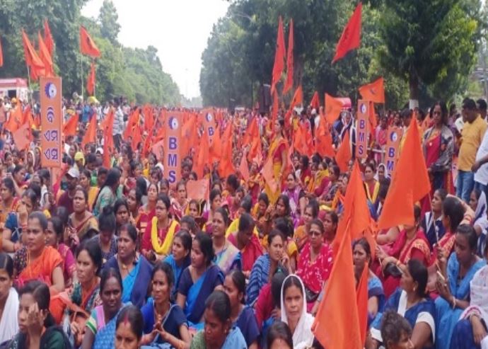 कई केंद्रीय ट्रेड यूनियनों के बैनर तले विरोध करने वालों में आंगनबाड़ी शिक्षक और सहायिकाएं, सरकारी स्कूल के रसोइये और मान्यता प्राप्त सामाजिक स्वास्थ्य कार्यकर्ता (आशा) शामिल थे। बीएमएस ने कहा था कि वह स्थायी नौकरियों की उनकी मांग का समर्थन करेगा।