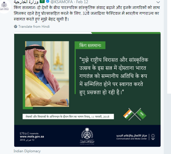 सऊदी शाह किंग सलमान ने भारत गणराज्य का Al Janadria ’ नेशनल कल्चरल फेस्टिवल में स्वागत किया
