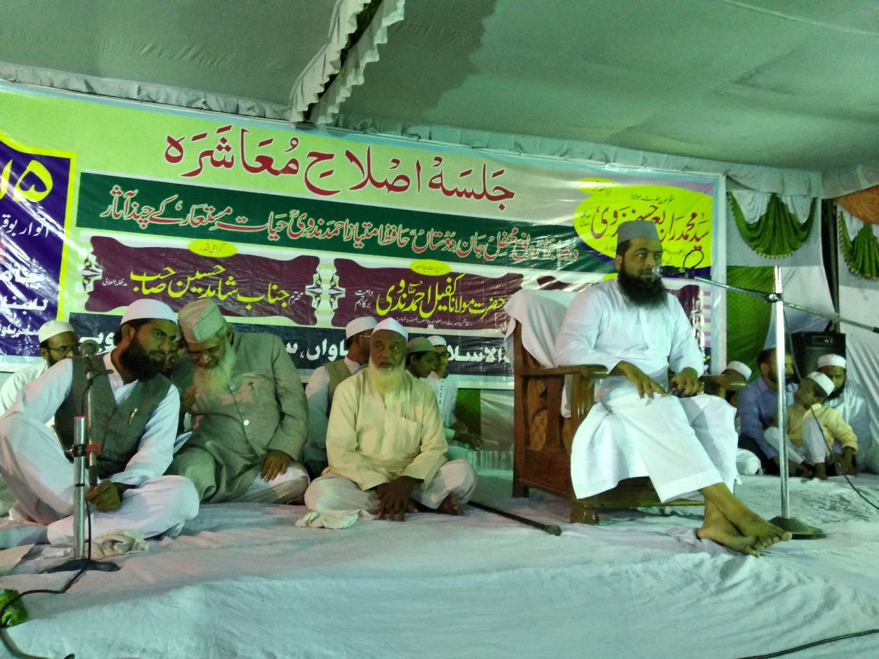 लखनऊ से पधारे मौलाना अब्दुल वदूद नदवी ने कहा कि मुसलमानों के पिछड़ेपन के जिम्मेदार कोई अन्य नही बल्कि स्वयं जिम्मेदार और दोषी हैं।तरक्की विकास के लिए खुद आगे बढ़ना पड़ेगा ।कोताही कदापि न करें।निरन्तर प्रयास जारी रखें।युवा वर्ग को कहा कि आप तो समाज सुधार में अहम भूमिका अदा कर सकते हो ।समाज में आपका स्थान रीढ़ की हड्डीके सामान है।समाज में प्रेम मुहब्बत बन्धुत्व का माहौल बनाये।पाश्चात्य संस्कृत शादी विवाह में बढ़ रही फुजूल खर्ची शराब नोशी नशा खोरी से बचे।इस्लाम धर्म के प्रवर्तक मोहम्मद साहब हमारे रोलमाडल है।उनकी दी गई शिक्षा पर अमल करें।अपने दीन और ईमान को महफूज रखें।