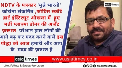 NDTV के पत्रकार 'मुन्ने भारती' कोरोना संकर्मित ,फोर्टिस स्कॉर्ट हार्ट इंस्टिट्यूट ओखला में हुए भर्ती प्लाज़्मा डोनर की अर्जेंट ज़रूरत परेशान हाल लोगों की आगे बढ़ कर मदद करने वाले इस योद्धा को आज हमारी और आप के मदद की ज़रुरत है 28, Sep, 2020