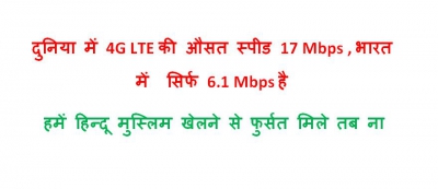 दुनिया में 4G LTE की औसत स्पीड 17 Mbps , भारत में सिर्फ 6.1 Mbps है; हमें हिन्दू मुस्लिम खेलने से फुर्सत मिले तब ना 17, Jul, 2018