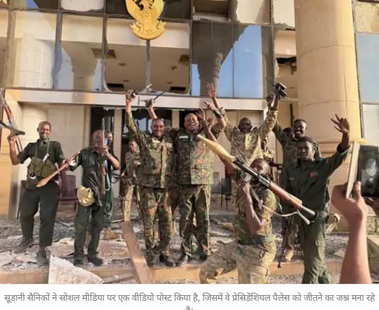 सूडानी सैनिकों ने सोशल मीडिया पर एक वीडियो पोस्ट किया है, जिसमें वे बता रहे हैं कि रमजान के 21वें दिन उन्होंने नील नदी के किनारे बने राष्ट्रपति भवन को अपने कब्जे में ले लिया है। रमजान का 21वां दिन शुक्रवार है।