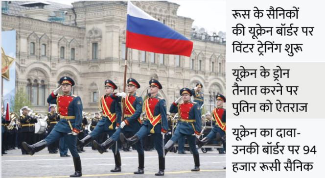 न्यूज एजेंसी एपी के मुताबिक, आधे रूसी सैनिक पहले से ही यूक्रेन बॉर्डर पर तैनात किए जा चुके है। वहीं, शुक्रवार को यूक्रेन के रक्षा मंत्री ओलेक्सी रेजनिकोव ने सांसदों को बताया कि रूस ने बॉर्डर पर फिलहाल 94,300 सैनिक तैनात कर रखे हैं और अगले साल जनवरी में सैनिकों की संख्या में बड़ा इजाफा हो सकता है।