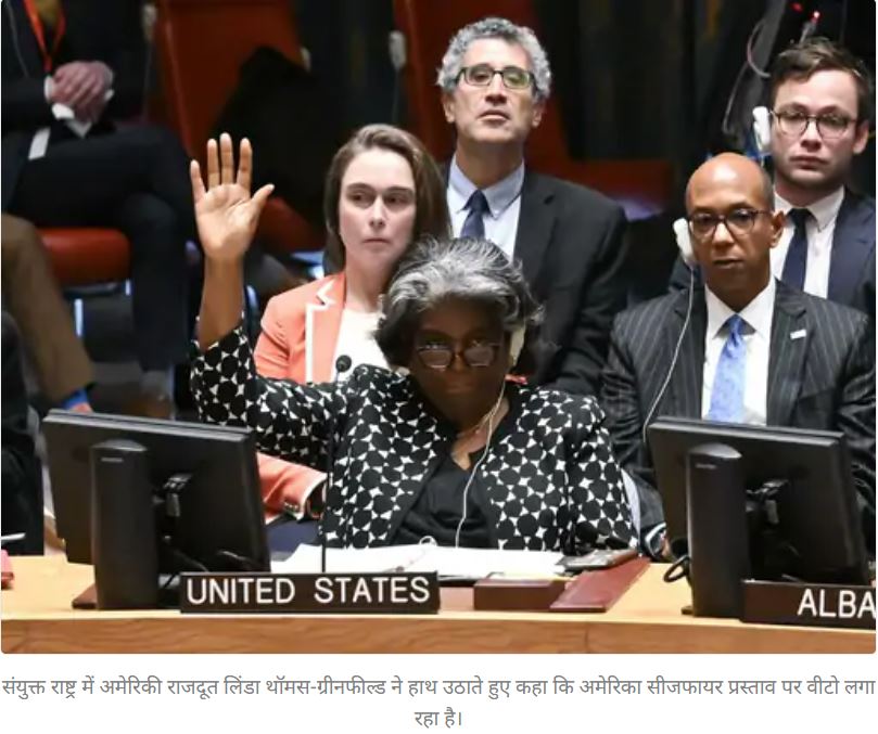 संयुक्त राष्ट्र में अमेरिकी राजदूत लिंडा थॉमस-ग्रीनफील्ड ने कहा- इस प्रस्ताव से अमेरिका, मिस्र, इजरायल और कतर के बीच फिलिस्तीनियों की सुरक्षा को लकर हो रही बातचीत खतरे में पड़ सकती है।