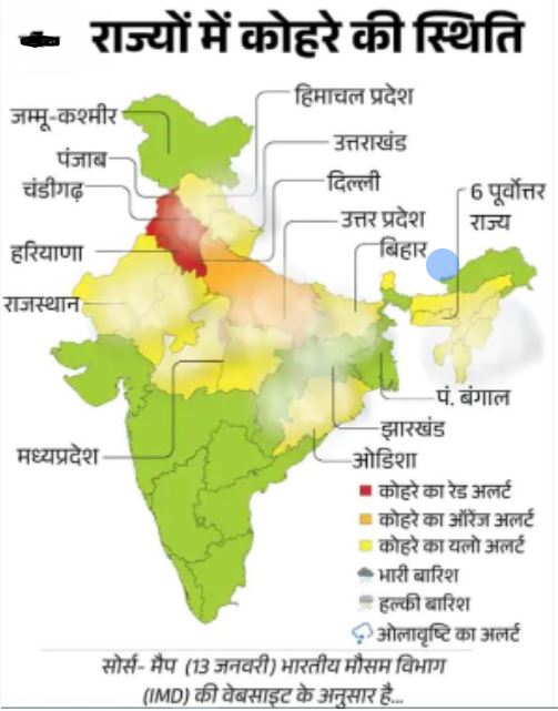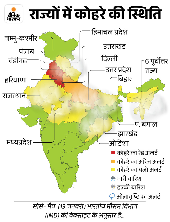 शनिवार (13) जनवरी की सुबह देश के 18 राज्यों में कोहरा दिखा। इनमें हिमाचल प्रदेश, उत्तराखंड, पंजाब, दिल्ली, हरियाणा, उत्तर प्रदेश, मध्य प्रदेश, राजस्थान, बिहार, सिक्किम, ओडिशा, असम, मेघालय, मणिपुर, त्रिपुरा, मिजोरम और नागालैंड शामिल हैं।