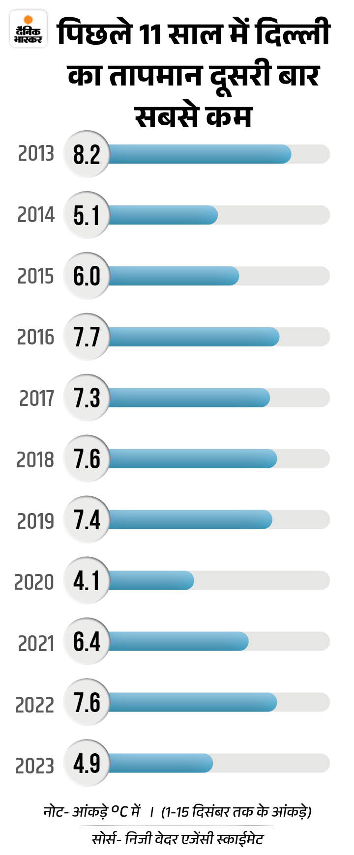 दिल्ली में शुक्रवार को सीजन का सबसे ठंडा दिन रहा। यहां न्यूनतम तापमान 4.9 डिग्री सेल्सियस दर्ज किया गया। दिल्ली में शिमला से भी ज्यादा ठंड है। शिमला में शुक्रवार को न्यूनतम तापमान 6.8 डिग्री सेल्सियस दर्ज किया गया।