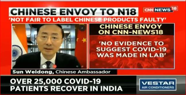 भारत स्थित चीनी राजदूत ने सीएनएन न्यूज 18 से बात की ; कहा इस बात के कोई सबूत नहीं की कोरोना वायरस लैब में तैयार हुआ है