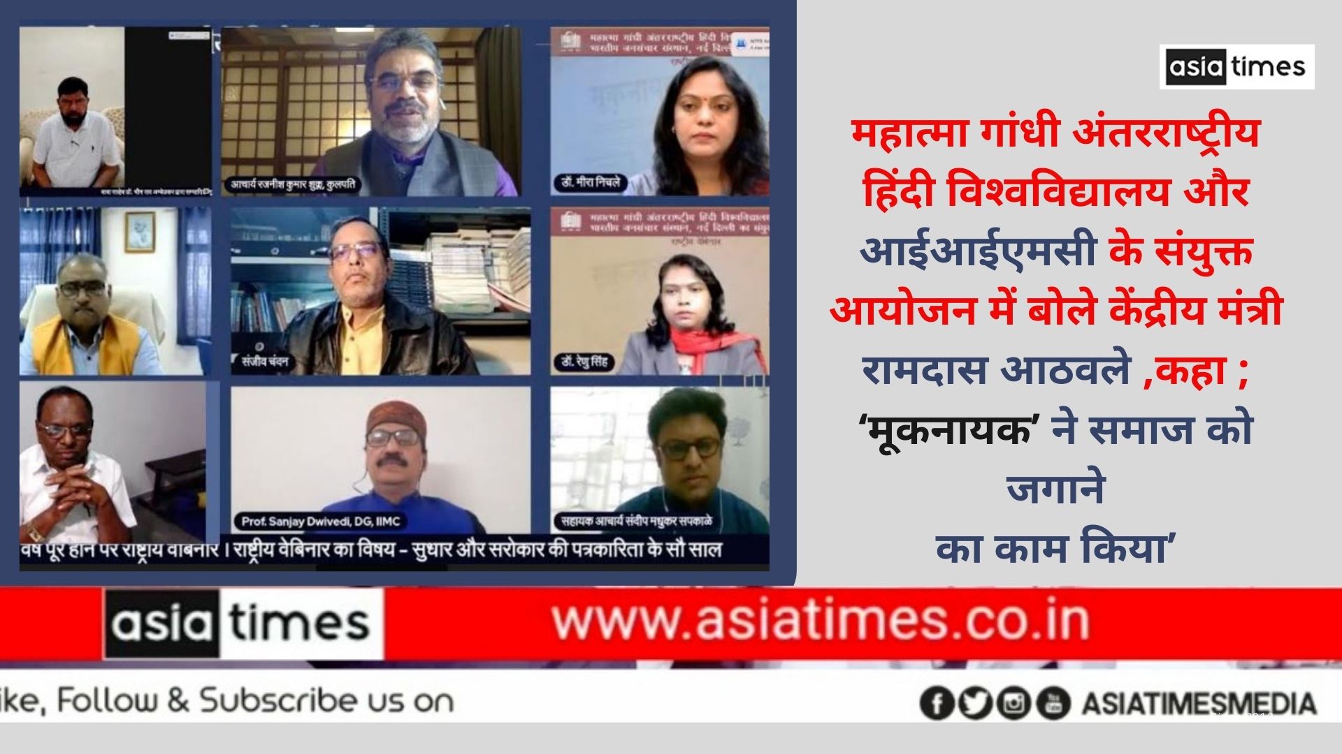 उनका हर शब्द समता के संदेश को प्रसारित करता है।'' यह विचार केंद्रीय सामाजिक न्याय एवं अधिकारिता राज्यमंत्री श्री रामदास आठवले ने महात्मा गांधी अंतरराष्ट्रीय हिंदी विश्वविद्यालय, वर्धा एवं भारतीय जन संचार संस्थान (आईआईएमसी), नई दिल्ली के संयुक्त तत्वाधान में आयोजित राष्ट्रीय वेबिनार में व्यक्त किए। बाबा साहेब द्वारा वर्ष 1920 में प्रकाशित पहले समाचार पत्र ‘मूकनायक’ के 100 वर्ष पूरे होने के अवसर पर इस वेबिनार का आयोजन किया गया।