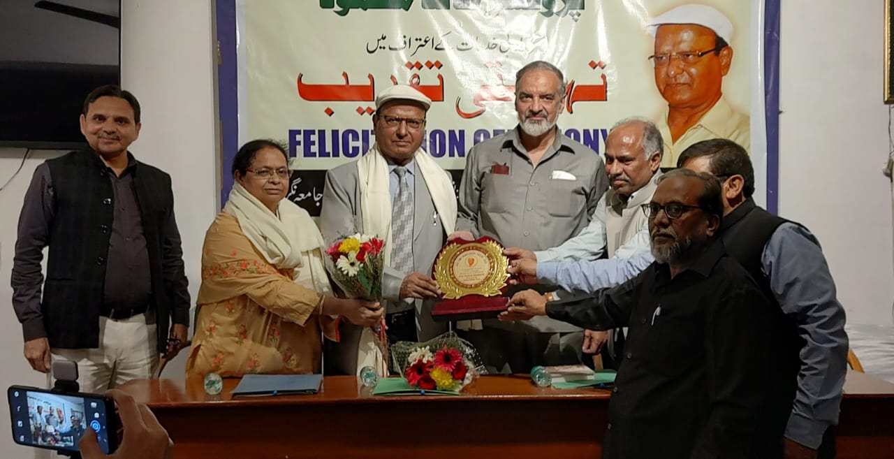 نئی دہلی ۔ اوکھلا پریس کلب کے زیر اہتمام تسمیہ آڈیٹوریم میں سابق صدر شعبہ اردو جامعہ ملیہ اسلامیہ پروفیسر خالد محمود کی علمی ادبی خدمات کے اعتراف میں تہنیتی تقریب کا انعقاد کیا گیا ۔