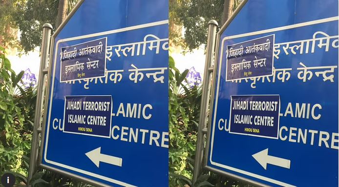 हिंदू सेना ने इंडिया इस्लामिक सेंटर के साइन बोर्ड पर 'जिहादी इस्लामिक आतंकवादी केंद्र' के पोस्टर चिपका दिए