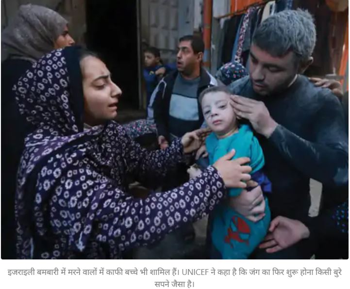 इजराइल-हमास के बीच हफ्तेभर के सीजफायर के बाद फिर जंग शुरू हो गई है। हमास के कब्जे वाली गाजा पट्टी की हेल्थ मिनिस्ट्री के मुताबिक- सीजफायर खत्म होने के बाद इजराइली डिफेंस फोर्सेस (IDF) के हमलों में 109 लोग मारे गए हैं। सैकड़ों लोग घायल हैं।