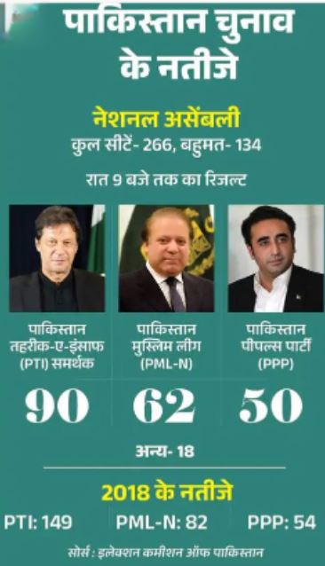 अब तक 265 में से 138 सीट के रुझान सामने आए हैं। इमरान की पार्टी के समर्थन वाले निर्दलीय 82 सीटों पर आगे हैं। 35 पर नवाज शरीफ की पार्टी पीएमएल-एन और 17 पर पाकिस्तान पीपुल्स पार्टी के कैंडिडेट्स आगे है।