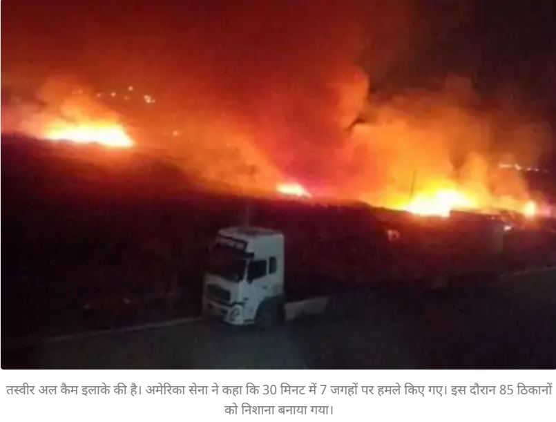 अमेरिका ने शनिवार सुबह इराक और सीरिया में 85 ईरानी ठिकानों पर हमला किया। ये अटैक 5 दिन पहले जॉर्डन-सीरिया बॉर्डर पर ड्रोन हमले में तीन सैनिकों की मौत के जवाब में किया गया।