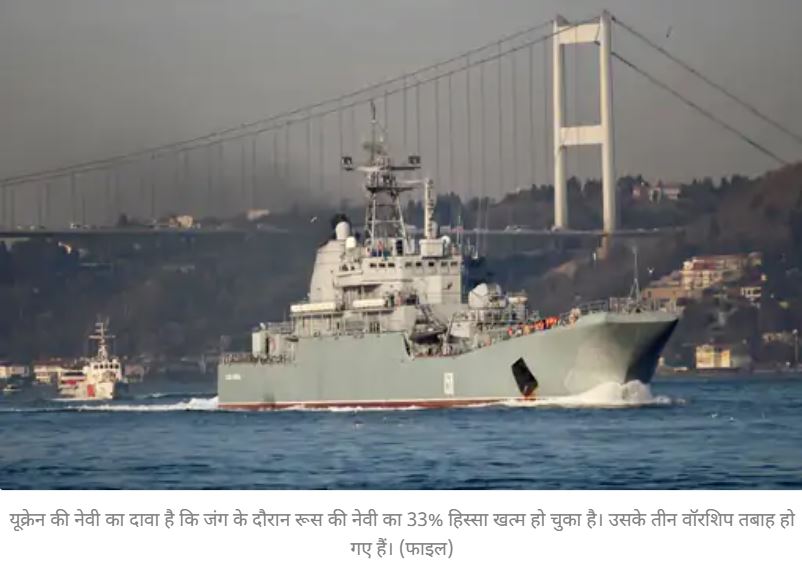 यूक्रेन की नेवी का दावा है कि जंग के दौरान रूस की नेवी का 33% हिस्सा खत्म हो चुका है। उसके तीन वॉरशिप तबाह हो गए हैं। इसके अलावा 24 छोटे शिप और कुछ सबमरीन भी अब इस्तेमाल के लायक नहीं हैं।