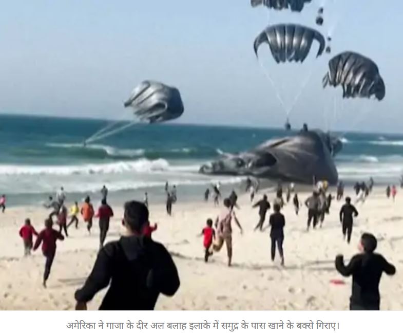 अमेरिका ने जंग के बीच गाजा में पहली बार मदद पहुंचाई है। अमेरिकी सेना के एयरक्राफ्ट ने पैराशूट से फिलिस्तीनियों के लिए खाने के बक्से गिराए। इन्हें लेने के लिए लोगों को समुद्र में दौड़ लगाते देखा गया।